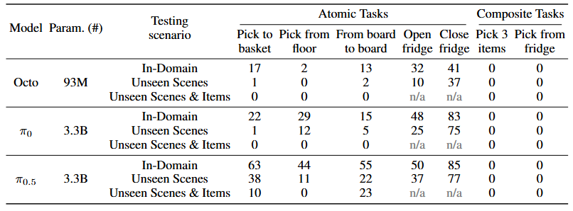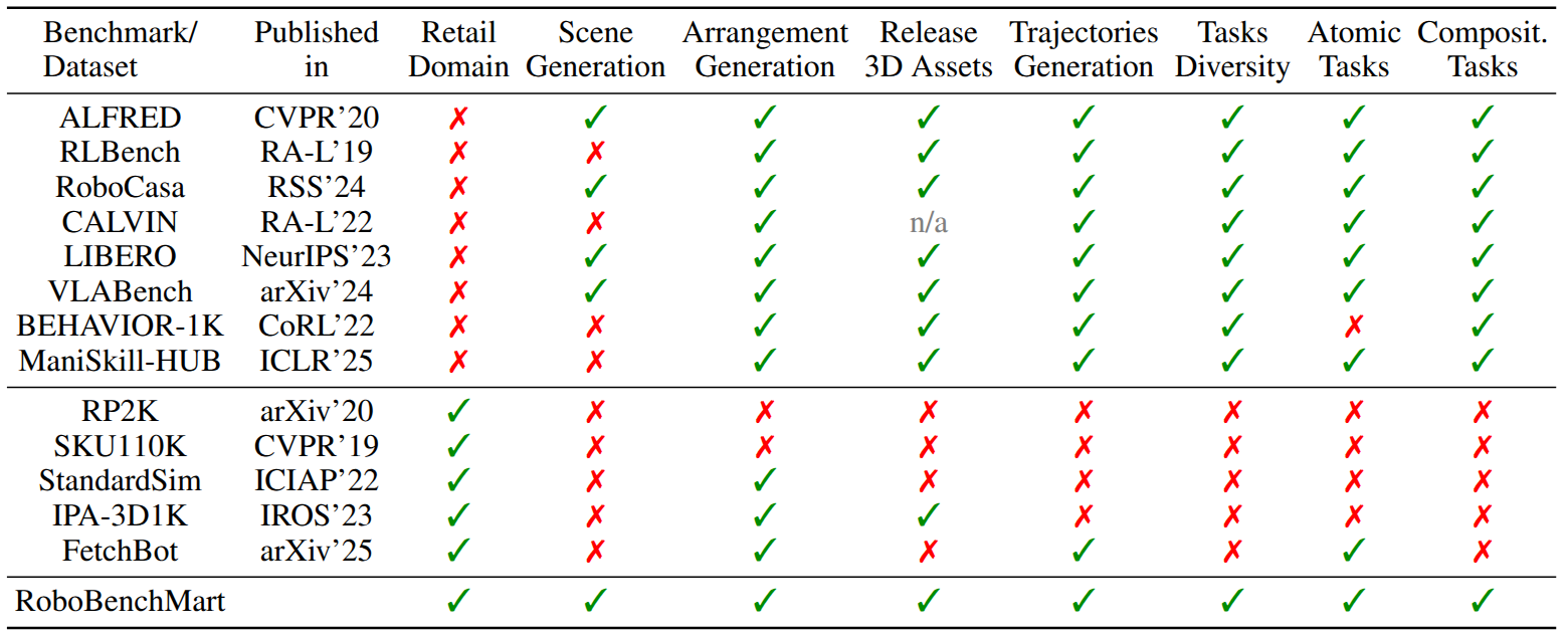 Existing benchmarks mostly focus on household tasks. However, retail and logistics scenarios — such as shelf picking or order packing — remain underexplored. Dedicated benchmarks for these domains are needed to advance robotic capabilities in retail environments.